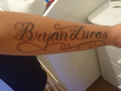 Depois passei no estúdio de tatuagem ver a arte que meu marido fez para o filho. O cara de pau disse que iam ser só 10 cm, e tatoou o antebraço quase que inteiro com o nome do nosso filho. Ficou lindo...com certeza nosso filho terá muito orgulho do papai. Mas falei pra ele que agora tá sem espaço para o nome dos próximos filhos...hehehehe (já que no outro braço tem meu nome)