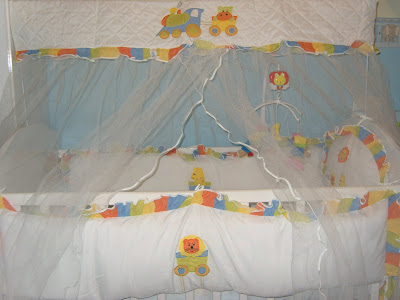 O kit é bem simples, foi comprado em 2007, quando eu pretendia engravidar, com algumas outras coisinhas. Como sempre desejei ter um menino, mesmo naquela época eu só comprava coisinhas azuis ou verde. Não deu outra, tudo serviu para o Bryan.Na época, umas amigas minhas falavam que eu nunca iria engravidar se não me livrasse de todas as coisas de enxoval que comprei. Depois de um ano até cheguei a pensar ser verdade. Mas dai desencanei, guardei tudo e falei que se fosse a hora que Deus determinou eu ia engravidar com as coisas compradas ou sem. E pra minha surpresa eu engravidei.